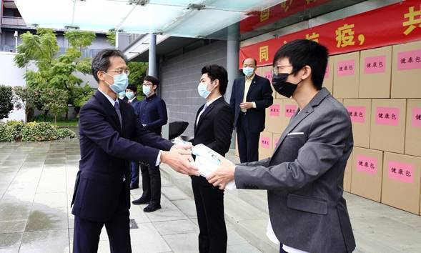 4月10日,中国驻悉尼总领事顾小杰(左一)向留学生代表发放“健康包”。(图片由中国驻悉尼总领馆提供)