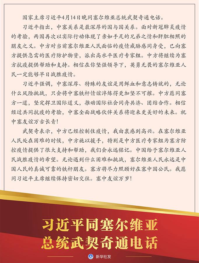 习近平指出,中塞关系是最深厚的国与国关系。面对新冠肺炎疫情的考验,两国再次以实际行动体现了亲如手足的兄弟之情和肝胆相照的朋友之义。中方对当前塞尔维亚人民面临的疫情威胁感同身受,已向塞方提供急需的医疗防护物资,派出高水平医疗专家组。中方将继续为塞方抗疫提供帮助和支持。相信在你坚强领导下,英勇无畏的塞尔维亚人民一定能够早日战胜疫情。