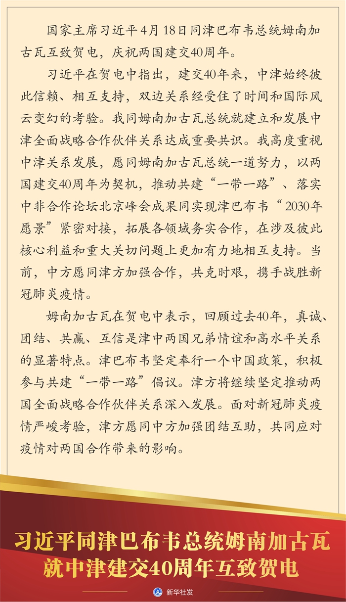 新华社北京4月18日电 国家主席习近平4月18日同津巴布韦总统姆南加古瓦互致贺电,庆祝两国建交40周年。