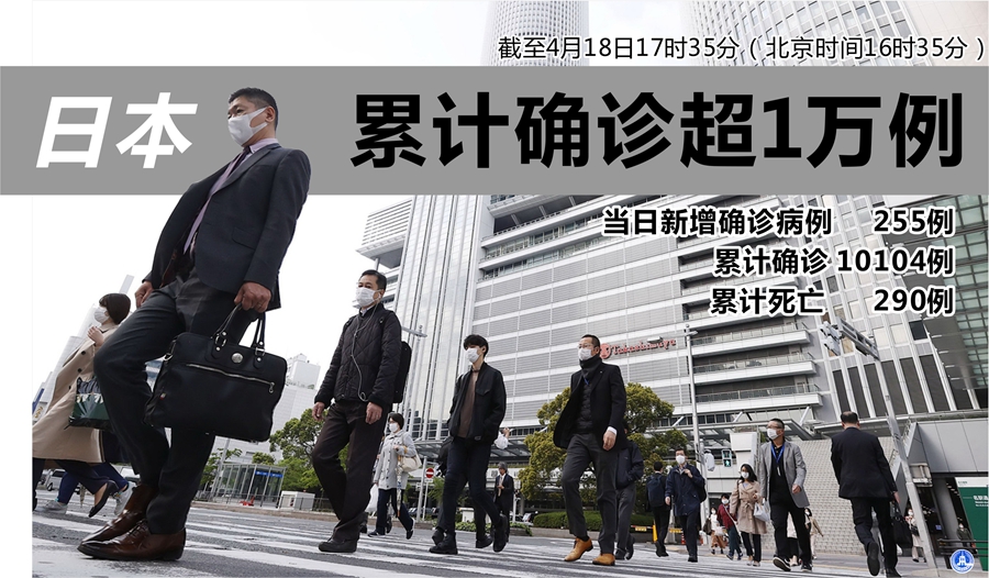 新华社东京4月18日电(记者华义)据日本广播协会(NHK)电视台的统计,截至18日17时35分(北京时间16时35分),日本当日新增确诊病例255例,累计确诊10104例;累计死亡290例。