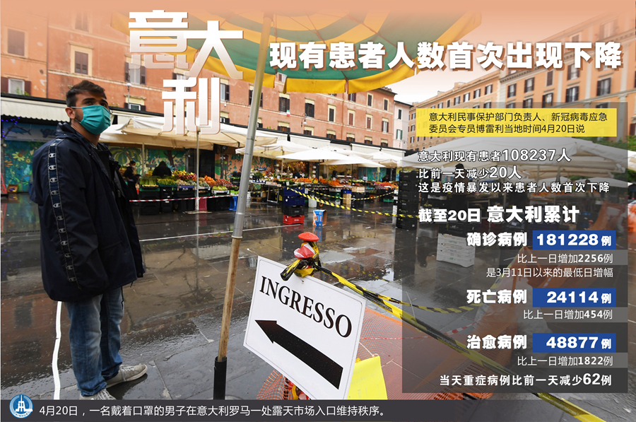 新华社罗马4月20日电(记者陈占杰)意大利民事保护部门负责人、新冠病毒应急委员会专员博雷利20日说,意大利现有患者108237人,比前一天减少20人。这是疫情暴发以来患者人数首次下降,显示疫情继续好转。