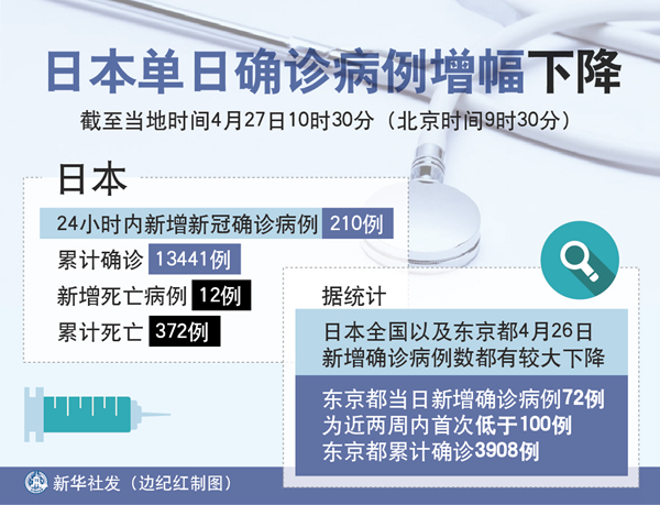 新华社东京4月27日电(记者华义)据日本广播协会(NHK)电视台统计,截至27日10时30分(北京时间9时30分),日本24小时内新增新冠确诊病例210例,累计确诊13441例;新增死亡病例12例,累计死亡372例。