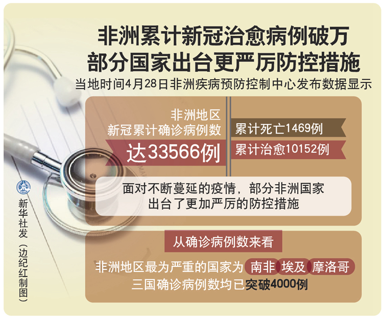 新华社洛美4月28日电 综合新华社驻非洲地区记者报道:非洲疾病预防控制中心28日发布数据显示,非洲地区新冠累计确诊病例数达33566例,累计死亡1469例,累计治愈10152例。面对不断蔓延的疫情,部分非洲国家出台了更加严厉的防控措施。
