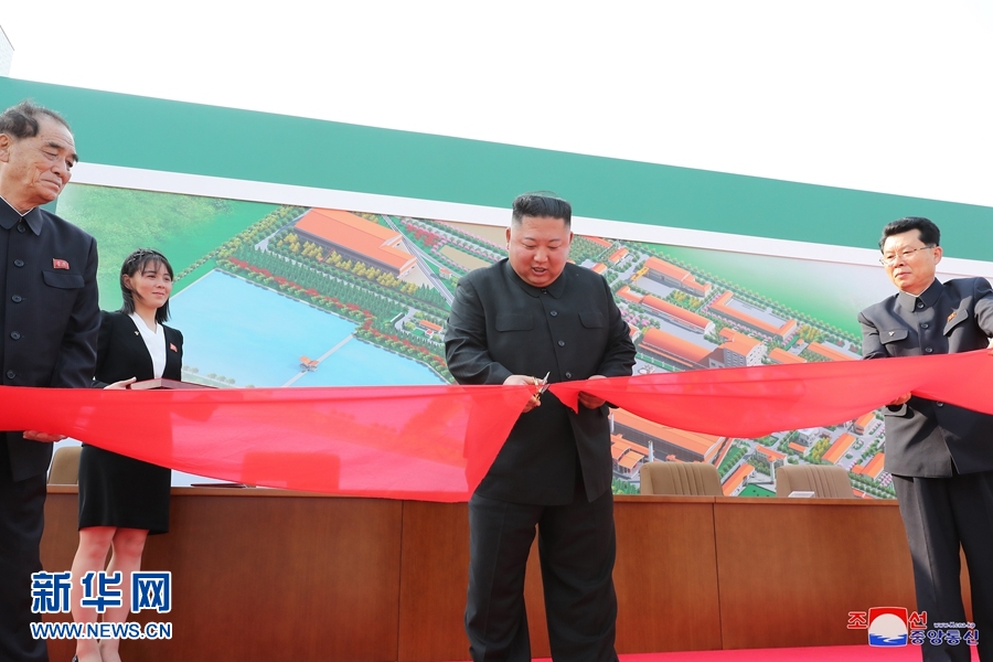 这张朝中社提供的照片显示,5月1日,朝鲜最高领导人金正恩(中)在顺川磷肥生产基地竣工仪式上剪彩。 新华社/朝中社