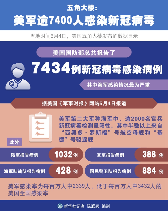 新华社华盛顿5月4日电(记者徐剑梅 邓仙来)美国五角大楼4日发布的数据显示,截至目前,美国国防部总共报告了7434例新冠病毒感染病例,其中海军感染情况最为严重。