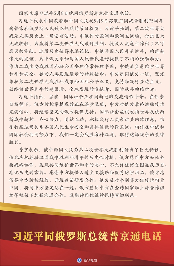 新华社北京5月8日电  国家主席习近平5月8日晚同俄罗斯总统普京通电话。