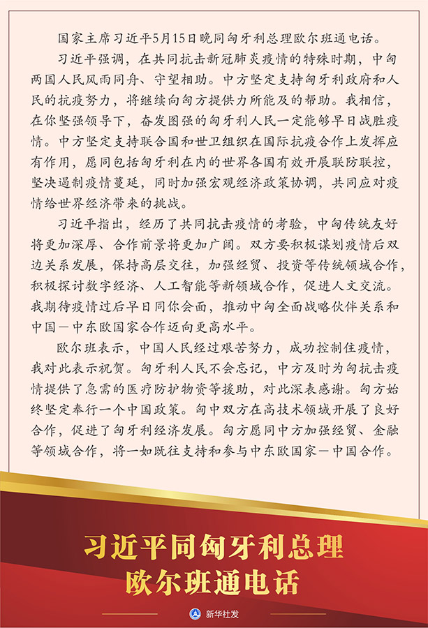 习近平强调,在共同抗击新冠肺炎疫情的特殊时期,中匈两国人民风雨同舟、守望相助。中方坚定支持匈牙利政府和人民的抗疫努力,将继续向匈方提供力所能及的帮助。我相信,在你坚强领导下,奋发图强的匈牙利人民一定能够早日战胜疫情。中方坚定支持联合国和世卫组织在国际抗疫合作上发挥应有作用,愿同包括匈牙利在内的世界各国有效开展联防联控,坚决遏制疫情蔓延,同时加强宏观经济政策协调,共同应对疫情给世界经济带来的挑战。