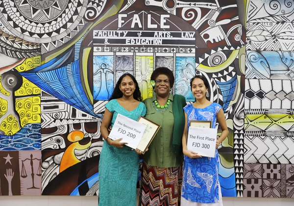 南太平洋大学文法学院院长阿卡尼西·科德拉雅特(中)为冠军(右一)与亚军颁发获奖证书与奖金。(图片为南太孔院提供)