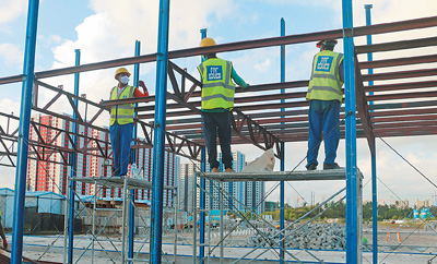 中国建筑集团有限公司援建的马尔代夫外籍劳工隔离观察设施施工现场,工人们在搭建桁架。(中国建筑集团有限公司供图)