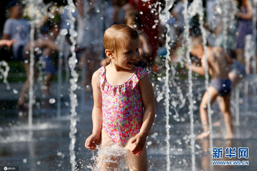 立陶宛迎来高温 萌娃喷泉戏水享清凉