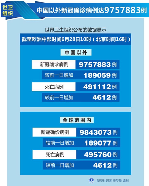 世卫组织每日疫情报告显示,截至欧洲中部时间28日10时(北京时间16时),中国以外新冠确诊病例较前一日增加189059例,达到9757883例;中国以外死亡病例较前一日增加4612例,达到491112例。