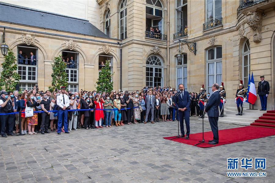7月3日,在法国巴黎总理府,卸任总理爱德华·菲利普与新任总理让·卡斯泰出席权力交接仪式。新华社发(奥雷利安·莫里萨尔 摄)