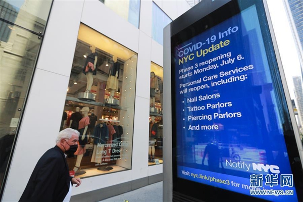 7月4日,一名行人从美国纽约第五大道显示新冠疫情最新情况的信息屏旁经过。新华社记者 王迎 摄