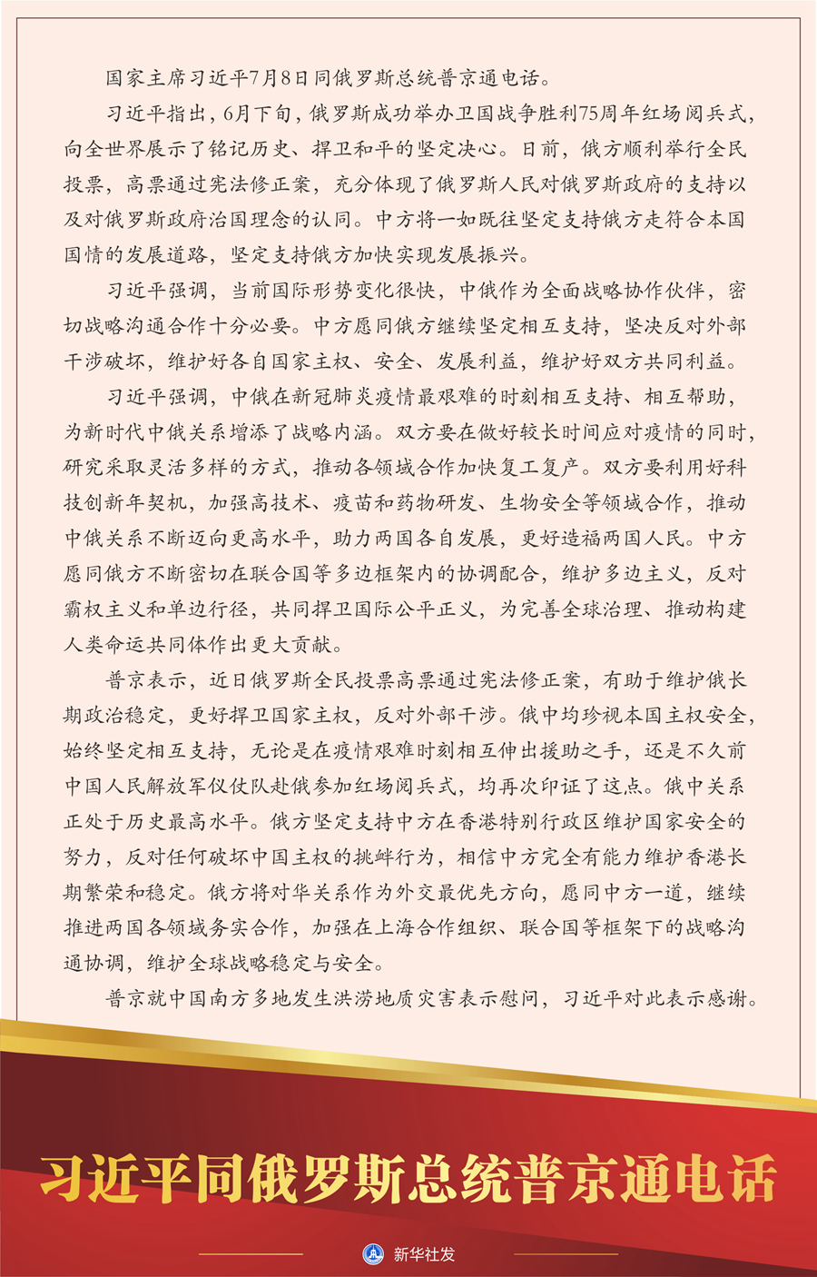 习近平指出,6月下旬,俄罗斯成功举办卫国战争胜利75周年红场阅兵式,向全世界展示了铭记历史、捍卫和平的坚定决心。日前,俄方顺利举行全民投票,高票通过宪法修正案,充分体现了俄罗斯人民对俄罗斯政府的支持以及对俄罗斯政府治国理念的认同。中方将一如既往坚定支持俄方走符合本国国情的发展道路,坚定支持俄方加快实现发展振兴。