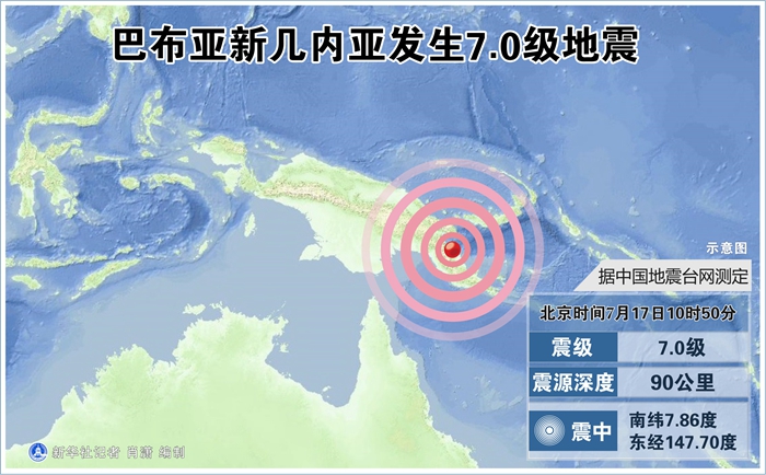 新华社快讯:中国地震台网正式测定:7月17日10时50分在巴布亚新几内亚(南纬7.86度,东经147.70度)发生7.0级地震,震源深度90千米。