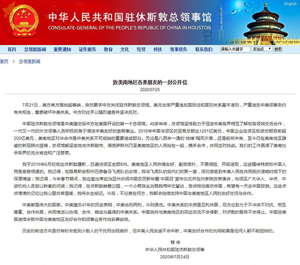 7月21日,美方单方面挑起事端,突然要求中方关闭驻休斯敦总领馆。美方此举严重违反国际法和国际关系基本准则,严重违反中美领事条约有关规定,蓄意破坏中美关系。中方对此予以强烈谴责并坚决反对。