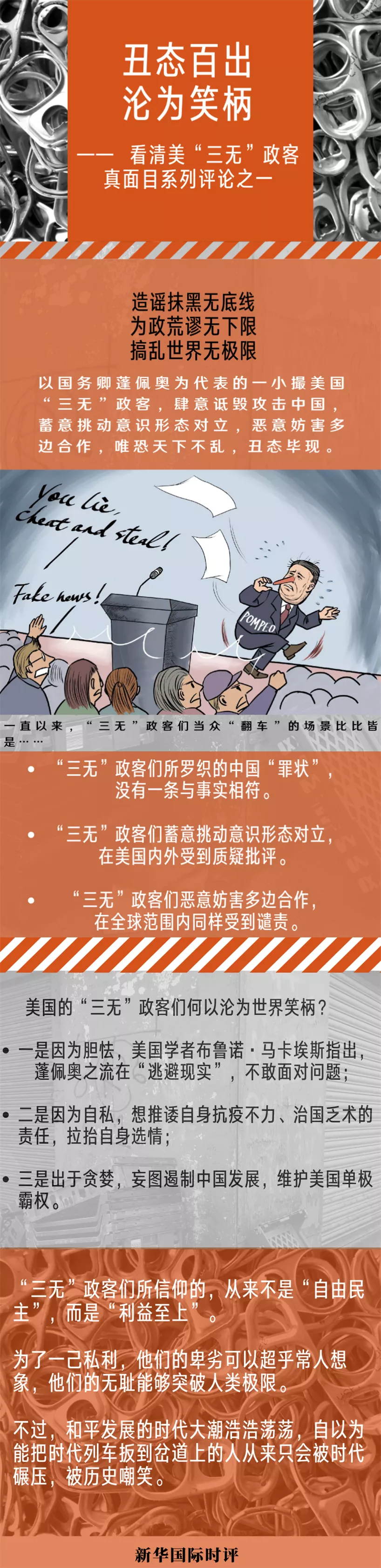 一段时间以来,以国务卿蓬佩奥为代表的一小撮造谣抹黑无底线、为政荒谬无下限、搞乱世界无极限的美国“三无”政客,肆意诋毁攻击中国,蓄意挑动意识形态对立,恶意妨害多边合作,唯恐天下不乱,丑态毕现。