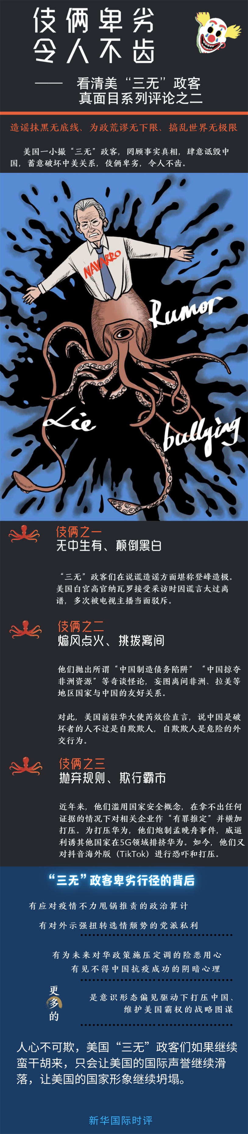 在这些“三无”政客卑劣行径的背后,有应对疫情不力甩锅推责的政治算计,有对外示强扭转选情颓势的党派私利,有为未来对华政策施压定调的险恶用心,有见不得中国抗疫成功的阴暗心理,更多的是意识形态偏见驱动下打压中国、维护美国霸权的战略图谋。