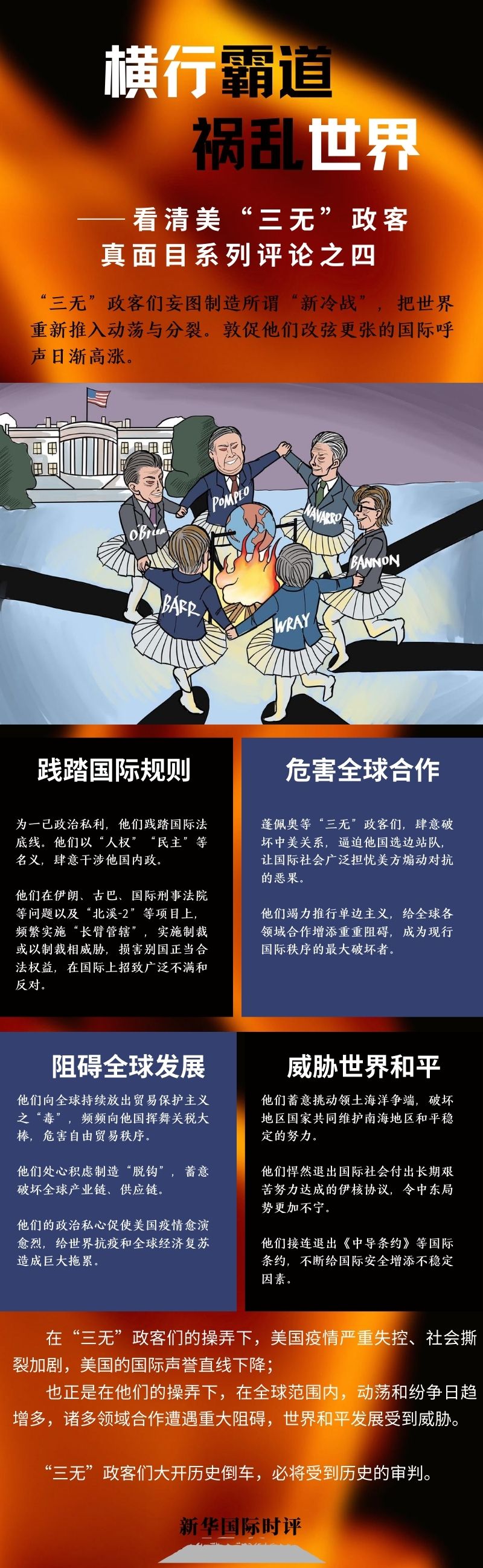 “三无”政客们的乱言与恶行,正在美国和国际上造成种种恶果。正是在他们的操弄下,美国疫情严重失控、社会撕裂加剧,美国的国际声誉直线下降;也正是在他们的操弄下,在全球范围内,动荡和纷争日趋增多,诸多领域合作遭遇重大阻碍,世界和平发展受到威胁。“三无”政客们大开历史倒车,必将受到历史的审判。