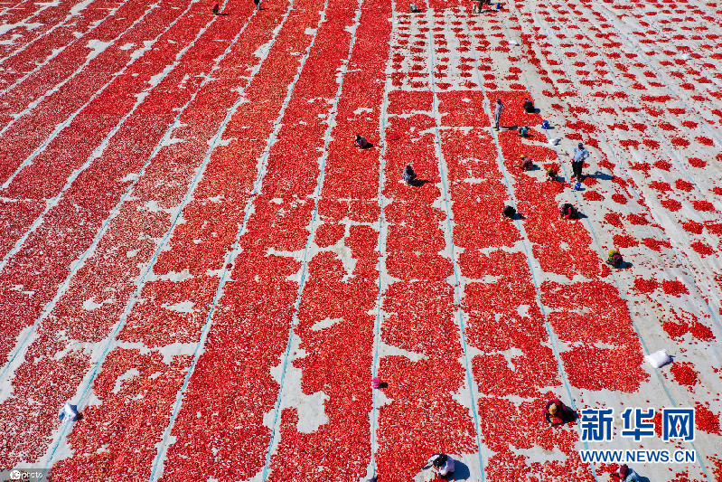 当地时间8月6日,土耳其伊兹密尔,俯瞰土耳其民众晾晒番茄壮观景象,宛如大地铺上红色地毯,蔚为壮观。工人将收集到的番茄运到加工厂,随后将番茄逐个切开,根据需求进行处理,放置在铺有塑料薄膜的晾晒场,在太阳下晒一个星期。(图片来源:东方IC)