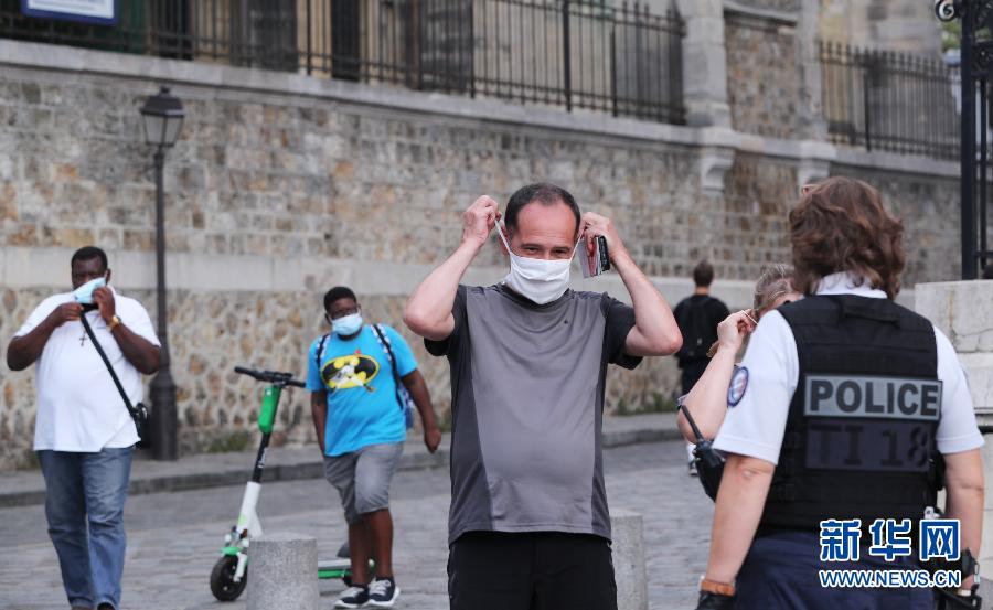 8月10日上午,警察在法国巴黎蒙马特高地提醒市民佩戴口罩。新华社记者 高静 摄