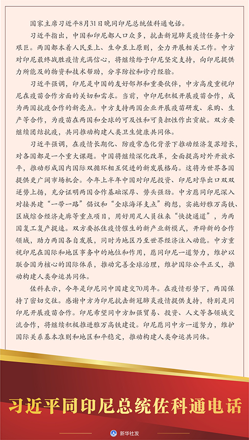 习近平指出,中国和印尼都人口众多,抗击新冠肺炎疫情任务十分艰巨。两国都本着人民至上、生命至上原则,全力开展相关工作。中方对印尼最终战胜疫情充满信心,将继续给予印尼坚定支持,向印尼提供力所能及的物资和技术帮助,分享防控和诊疗经验。