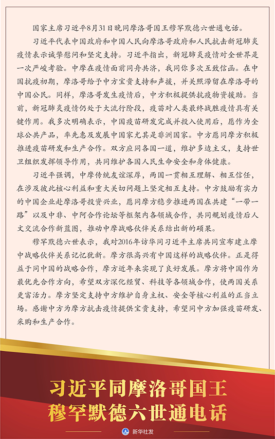 习近平代表中国政府和中国人民向摩洛哥政府和人民抗击新冠肺炎疫情表示诚挚慰问和坚定支持。习近平指出,新冠肺炎疫情对全世界是一次严峻考验。中摩在疫情面前同舟共济,我同你多次互致信函。在中国抗疫初期,摩洛哥给予中方宝贵支持和声援,并关照滞留在摩洛哥的中国公民。同样,摩洛哥发生疫情后,中方积极提供抗疫物资援助。当前,新冠肺炎疫情仍处于大流行阶段,疫苗对人类最终战胜疫情具有关键作用。我多次明确表示,中国疫苗研发完成并投入使用后,愿作为全球公共产品,率先惠及发展中国家尤其是非洲国家。中方愿同摩方积极推进疫苗研发和生产合作。双方应同各国一道,维护多边主义,支持世卫组织发挥领导作用,共同维护各国人民生命安全和身体健康。