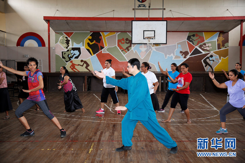斐济中国文化中心主任孙杰带领斐济老师们练习太极拳。(记者 张永兴 摄)
