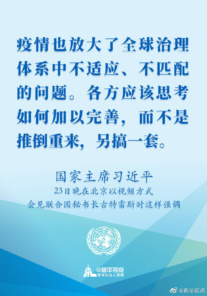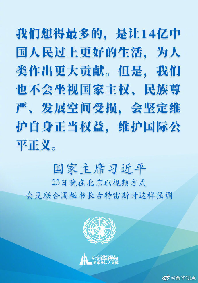 国家主席习近平23日晚在北京以视频方式会见联合国秘书长古特雷斯时讲话的金句