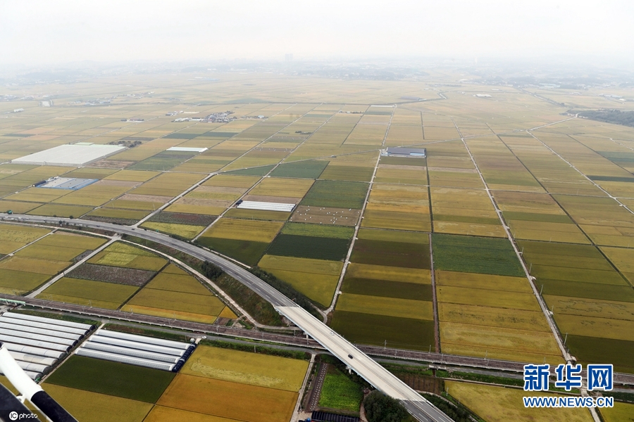 当地时间10月3日,韩国金堤市,韩国中秋假期的第四天,航拍金堤市金黄的农田。(图片来源:东方IC)