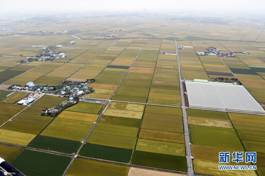 当地时间10月3日,韩国金堤市,韩国中秋假期的第四天,航拍金堤市金黄的农田。(图片来源:东方IC)