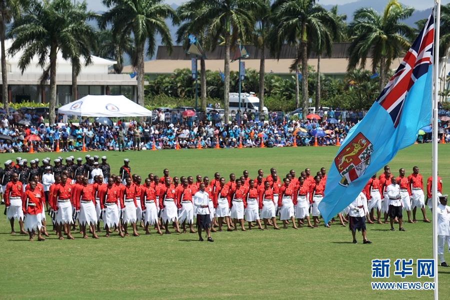 图为斐济武装部队受阅方队通过检阅台。10月10日,斐济在首都苏瓦的阿尔伯特公园举行典礼,隆重庆祝国家独立50周年。包括斐济领导人、中国驻斐济大使钱波等外国使团驻斐代表及斐济各界人士约数千人出席典礼。(张永兴摄)