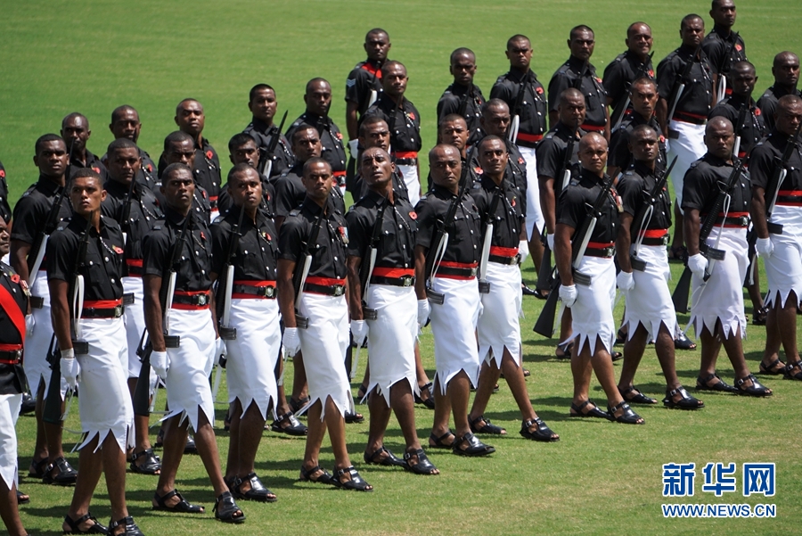 图为接受检阅的斐济警察男子受阅方队。10月10日,斐济在首都苏瓦的阿尔伯特公园举行典礼,隆重庆祝国家独立50周年。包括斐济领导人、中国驻斐济大使钱波等外国使团驻斐代表及斐济各界人士约数千人出席典礼。(张永兴摄)