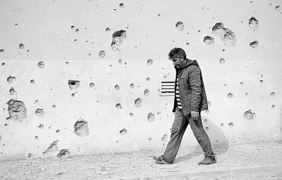 9月29日,在阿塞拜疆临近纳卡边境的塔塔尔地区,一名村民从布满弹孔的墙壁旁经过。新华社发