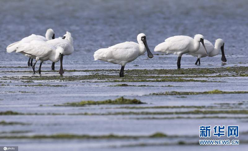 日本:全球濒危物种黑脸琵鹭在河边觅食