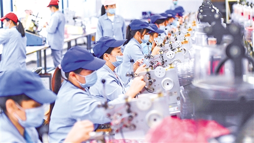 近日,江西省宜春市袁州医药工业园华讯电子制品有限公司员工加班完成发往越南等国家的生产订单。 刘继刚摄(中经视觉)