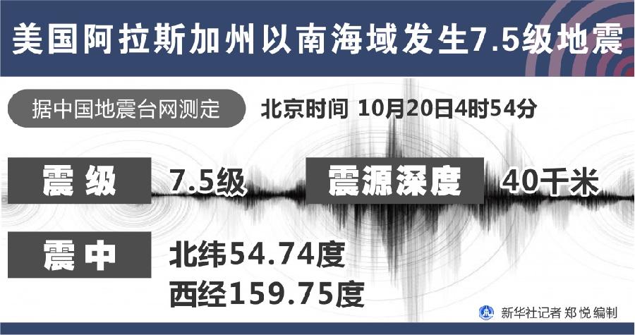 新华社快讯:中国地震台网正式测定,10月20日4时54分在美国阿拉斯加州以南海域(北纬54.74度,西经159.75度)发生7.5级地震,震源深度40千米。