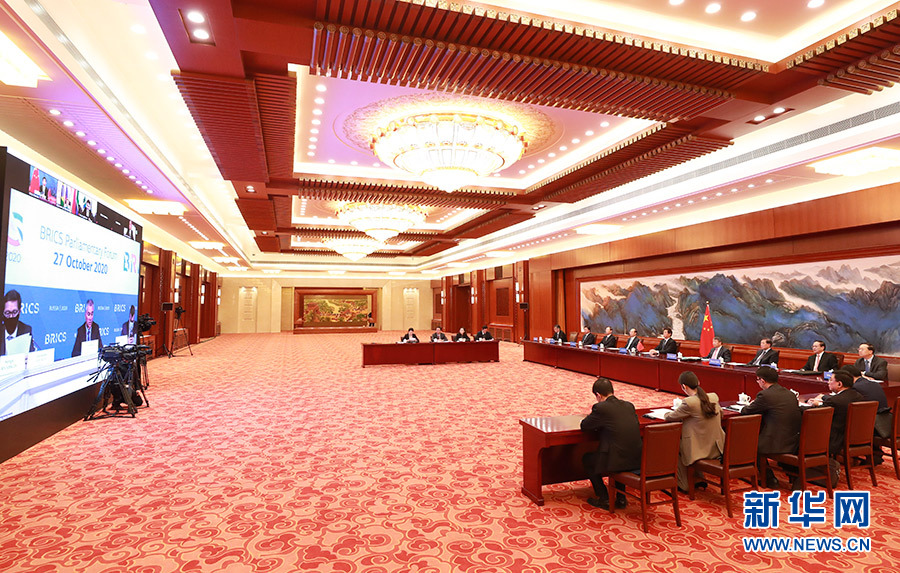 新华社北京10月27日电 全国人大常委会委员长栗战书27日在北京人民大会堂出席第六届金砖国家议会论坛视频会议并发表讲话。