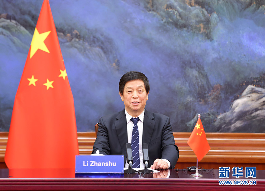 10月27日,全国人大常委会委员长栗战书在北京人民大会堂出席第六届金砖国家议会论坛视频会议并发表讲话。 新华社记者 庞兴雷 摄
