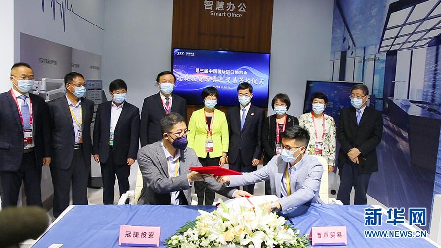 第三届进博会开展首日,上海市青浦区交易团企业晋声(上海)贸易有限公司与参展商冠捷投资有限公司在技术装备展区(4.1馆)举行签约仪式。本次签约是上海交易团“首单”,订单内容涉及智慧显示类产品、液晶显示面板以及电子元件等原材料。