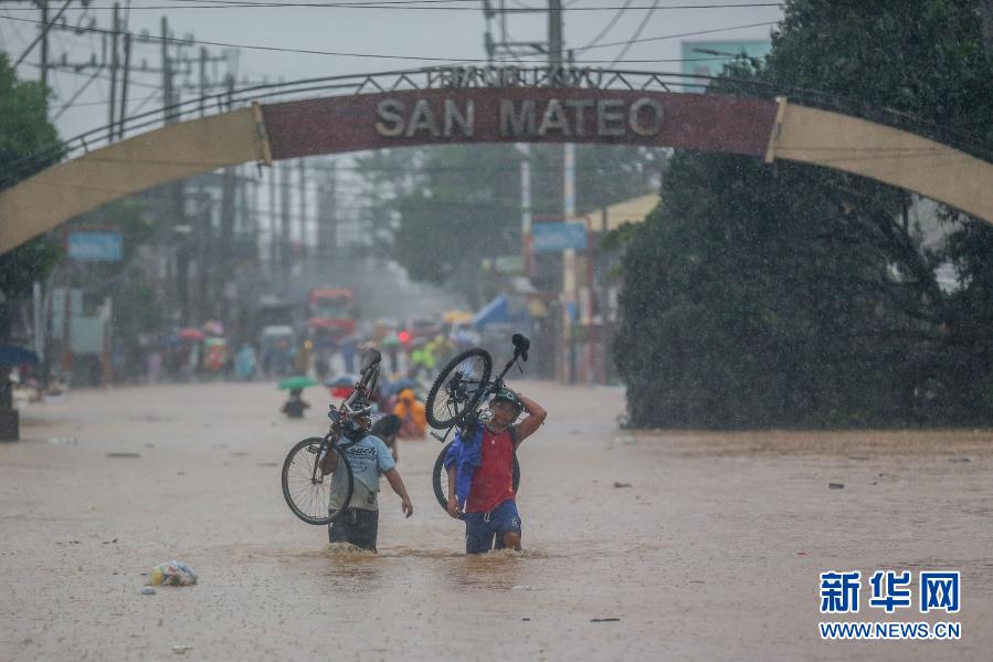 11月12日,在菲律宾黎刹省,当地居民在洪水中前行。新华社发(乌马利摄)