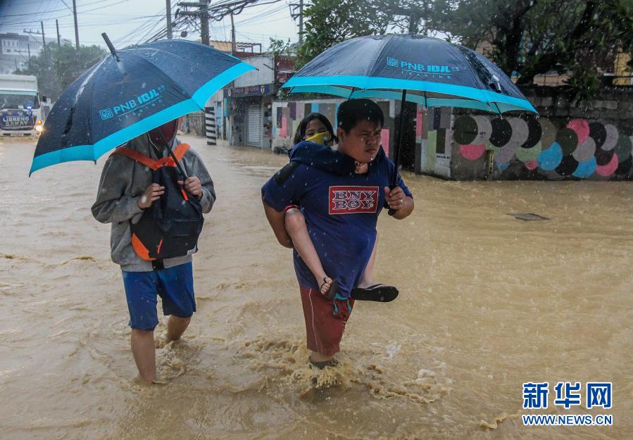 11月12日,在菲律宾马尼拉,当地居民在洪水中前行。新华社发(乌马利摄)