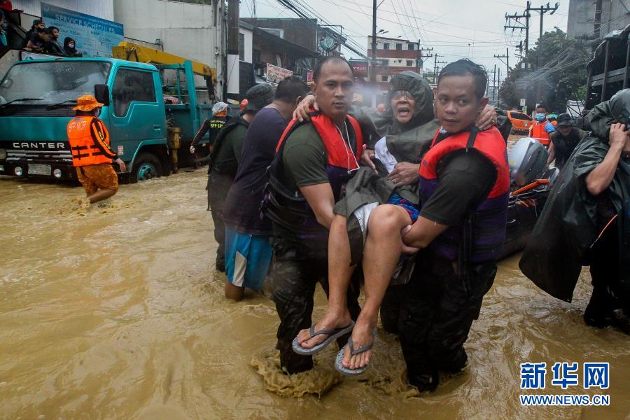 11月12日,在菲律宾马尼拉,救援人员帮助被洪水围困的居民转移。新华社发(乌马利摄)