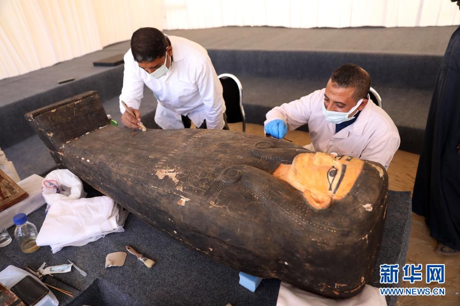 11月14日,在埃及吉萨,考古工作人员清理一具彩绘木棺。埃及旅游和文物部长哈立德·阿纳尼14日宣布,在吉萨省塞加拉地区出土100具距今约2500年的彩绘木棺,这是埃及本年度最大的考古发现。新华社发(艾哈迈德·戈马摄)