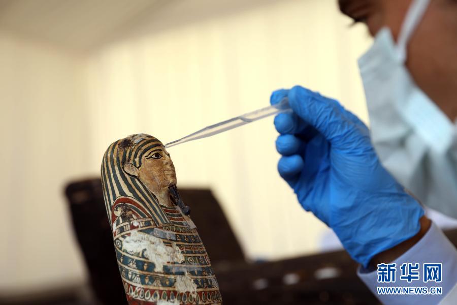 11月14日,在埃及吉萨,一名考古工作人员在彩绘木棺发现现场工作。埃及旅游和文物部长哈立德·阿纳尼14日宣布,在吉萨省塞加拉地区出土100具距今约2500年的彩绘木棺,这是埃及本年度最大的考古发现。新华社发(艾哈迈德·戈马摄)