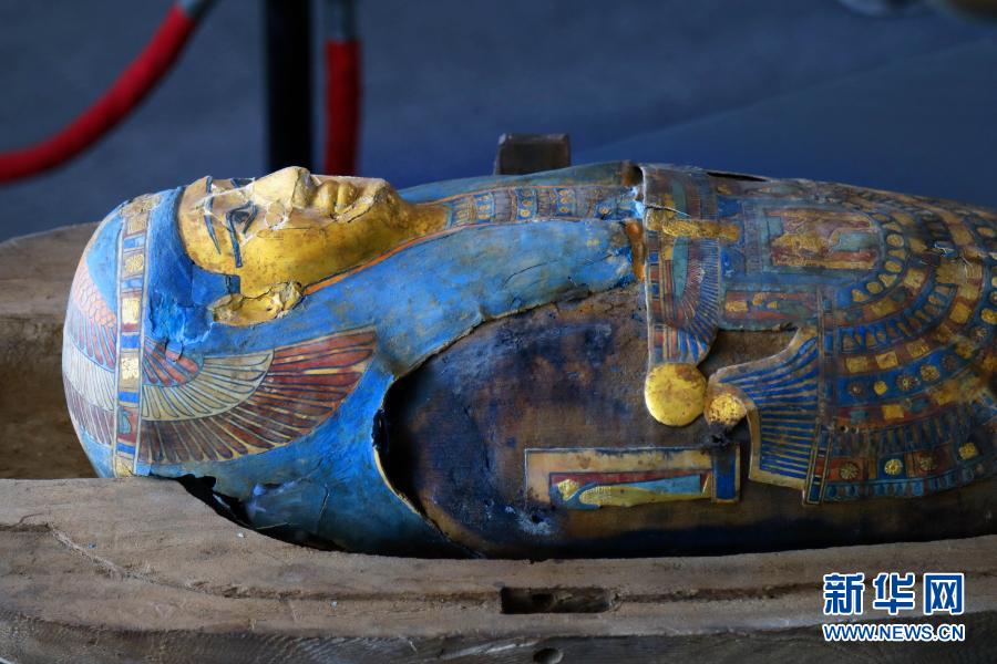 这是11月14日在埃及吉萨拍摄的彩绘木棺。埃及旅游和文物部长哈立德·阿纳尼14日宣布,在吉萨省塞加拉地区出土100具距今约2500年的彩绘木棺,这是埃及本年度最大的考古发现。新华社发(艾哈迈德·戈马摄)