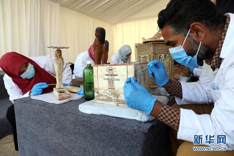 11月14日,在埃及吉萨,考古工作人员在彩绘木棺发现现场工作。埃及旅游和文物部长哈立德·阿纳尼14日宣布,在吉萨省塞加拉地区出土100具距今约2500年的彩绘木棺,这是埃及本年度最大的考古发现。新华社发(艾哈迈德·戈马摄)
