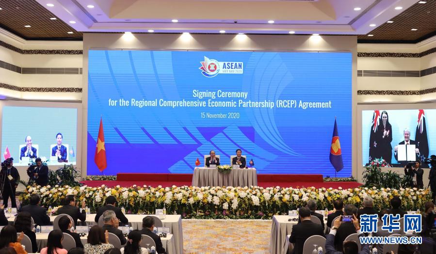 这是11月15日在越南首都河内拍摄的区域全面经济伙伴关系协定(RCEP)签署仪式现场。