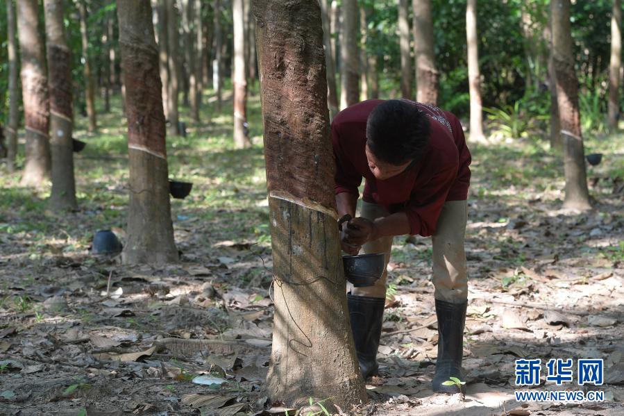 11月15日,一名割胶工在泰国庄他武里府的一座橡胶园内收割橡胶。
