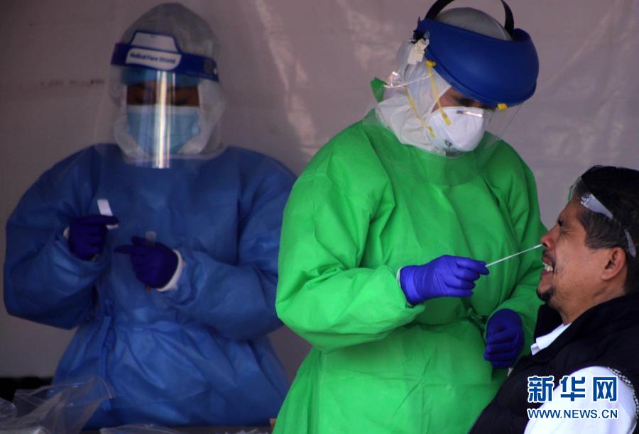 11月14日,在墨西哥首都墨西哥城,医务人员为一名男子采集检测样本。